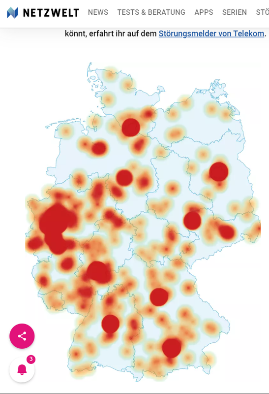 Der Peak in obiger Grafik deckt sich mit dem Eingang der Lesermail um 6.14 Uhr. Es scheint sich auch um eine flächendeckend auftretende Störung zu handeln, wie Grafiken bei allestoerungen.de und netzwelt auf Deutschlandkarten anzeigen.