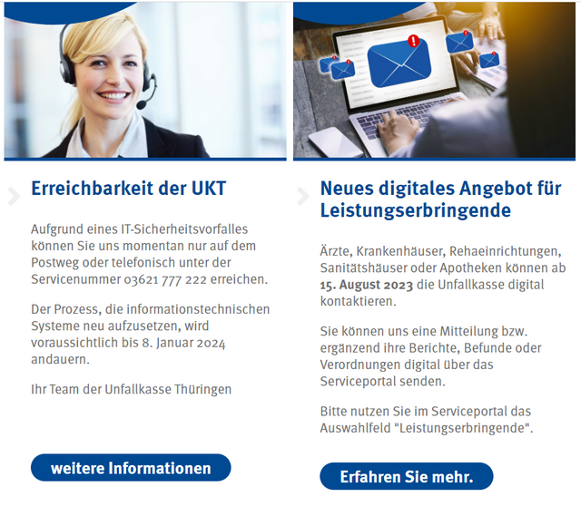 Die Unfallkasse Thüringen (UKT) ist wohl von einem Sicherheitsvorfall in deren IT betroffen, der wohl zum 18. Dezember 2023 festgestellt wurde. Auf Grund dieses Vorfalls ist die IT der Unfallkasse nicht mehr verfügbar und die Erreichbarkeit eingeschränkt. Selbst E-Mail-Anfragen sind nicht mehr möglich. Die UKT teilt mit, dass die Verfügbarkeit der IT nicht vor Ablauf der ersten Januarwoche 2024 gegeben ist.