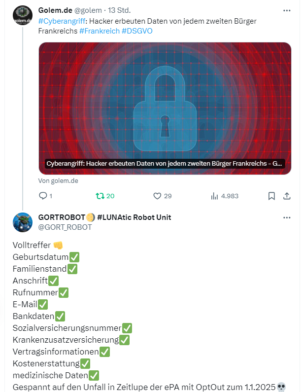 Obige zwei Tweets greifen das noch ein wenig genauer auf. Eine Mitteilung an die Commission Nationale de l'Informatique et des Libertés (CNIL, die französische Datenschutzbehörde) legt das Desaster offen. Die CNIL hat eine Untersuchung eingeleitet, da der Datenschutzvorfall bei Viamedis und Almerys, zwei Betreiber, die die Drittzahlerabwicklung für zahlreiche Zusatzkrankenversicherungen und Krankenkassen übernehmen, Ende Januar 2024 mehr als 33 Millionen Personen in Frankreich betrifft.