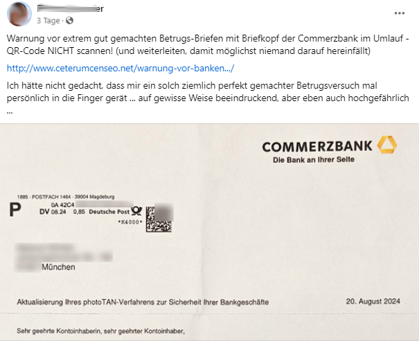 Denn im – per Post versandten und zugestellten Brief der angeblichen "Commerzbank" fand sich neben dem Hinweis auf die "Sicherheit Ihrer Bankgeschäfte" mit Aufforderung zur Aktualisierung des photoTAN-Verfahrens ein QR-Code, der angeblich zur Reaktivierung des Verfahrens führt. Der QR-Code führt auf eine Phishing-Seite, die das Ziel hat, persönliche Daten zum Bankkonto und zum Online-Banking zu erhalten und das Konto zu übernehmen. Franz Neumeier hat den Sachverhalt in seinem Blog-Beitrag Warnung vor Banken-Betrugsversuch per QR-Code in Briefpost dokumentiert – vielleicht die potentiellen Kandidaten im persönlichen Umfeld bezüglich dieser neuen Masche informieren. Ein Nutzer hat dann auf Facebook noch auf diesen BR-Beitrag hingewiesen, der diese Problematik, die bisher nur auf München begrenzt scheint, anspricht und vor warnt. Ergänzung: Zufall? Auf Focus gibt es diesen Artikel, der sich ebenfalls mit der Thematik befasst.