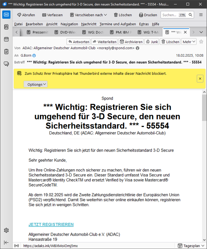 Eine weitere Phishing-Mail versuchte mir weiszumachen, dass ich mich umgehend beim neuen Sicherheitsstandard 3-D Secure des ADAC registrieren soll.