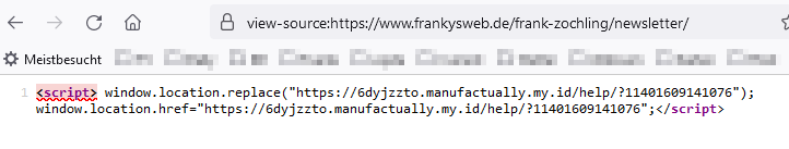 Nachdem ich die URL von Franks Seite mehrfach aufgerufen habe, wird mir diese wieder "sauber" angezeigt. Sieht mir wie eine gekaperte Hauptseite (möglicherweise über böswillige Werbeanzeigen aus). Unterseiten auf Artikel, die ich in Suchmaschinen gefunden habe, wurde sauber aufgerufen.