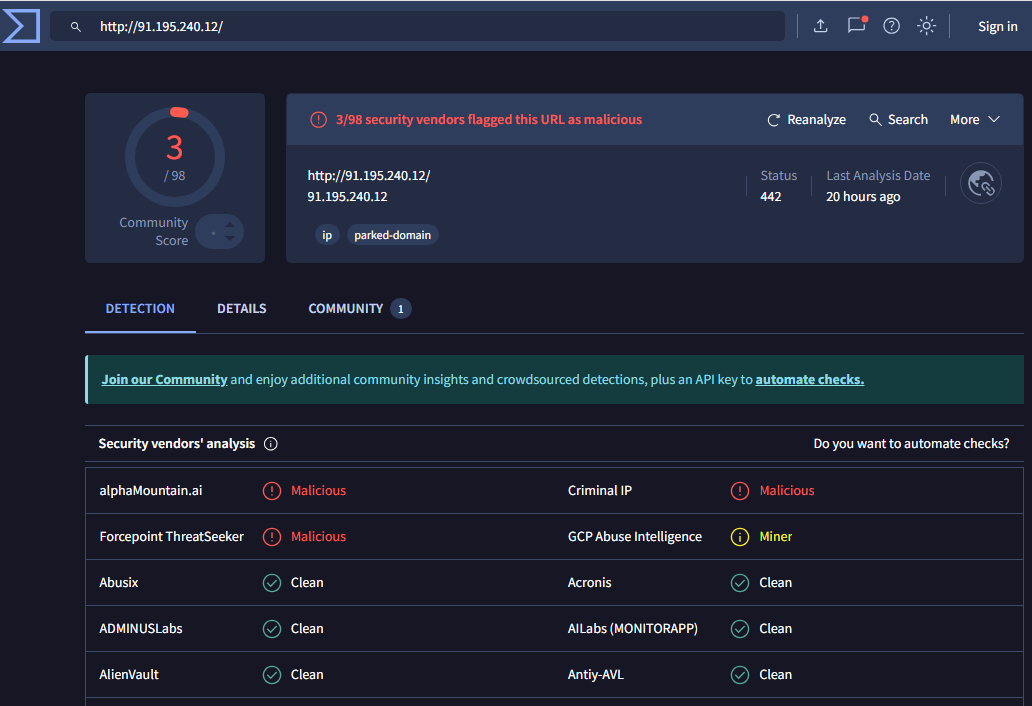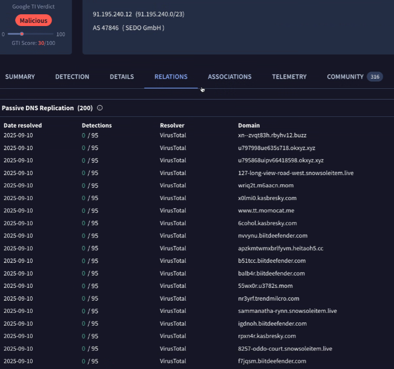 Der Leser schrieb, dass der Virenscanner im Unternehmen sowie die Network Protection des Microsoft Defender for Endpoint deshalb jedes Mal Alarm schlagen. Laut Leser laufen andere verdächtige Domains auf diese IP 91.195.240.12. Nachfolgend eine Screenshot, den mir der Leser zukommen ließ.
