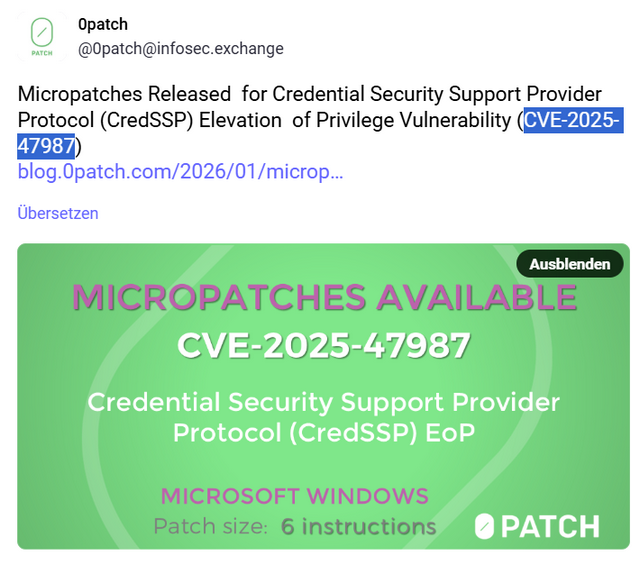 ACROS Security hat bereits zum 6. Januar 2026 im Beitrag Micropatches Released for Credential Security Support Provider Protocol (CredSSP) Elevation of Privilege Vulnerability (CVE-2025-47987) bekannt gegeben, dass man einen 0patch Microfix für die Schwachstelle CVE-2025-47987 entwickelt habe.