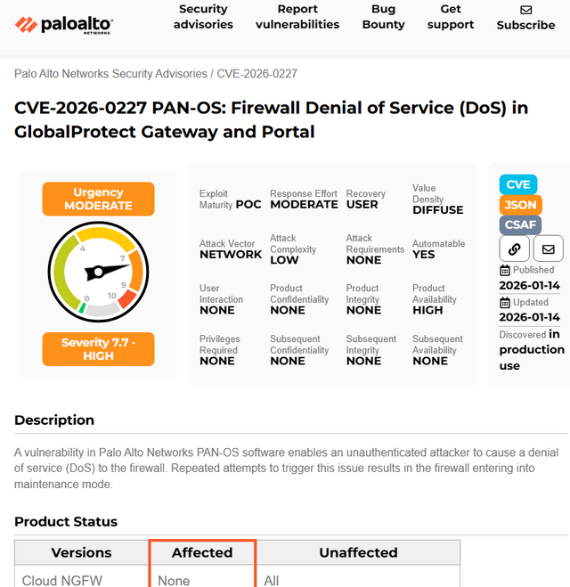 Von Palo Alto Networks gab es eine Sicherheitswarnung vor der Schwachstelle CVE-2026-0227.