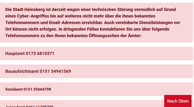 Die in Nordrhein-Westfalen, nördlich von Aachen, nahe an der niederländischen Grenze gelegene Stadt Heinsberg ist derzeit weder per Telefon noch per Internet erreichbar. Es ist von einer "technischen Störung" die Rede, wobei als Ursache ein Cyberangriff vermutet wird. Wie lange dieser Ausfall dauert, ist derzeit unbekannt.