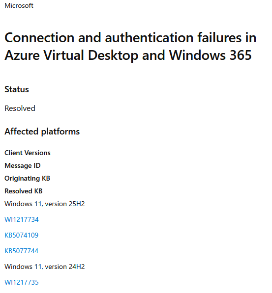 Diese Probleme wurden von weiteren Lesern bestätigt, und ich hatte das Ganze ausführlicher im Blog-Beitrag Windows Januar 2026-Updates verursachen Verbindungs- und Authentifizierungsfehler beschrieben. Microsoft hat im Release Health Dashboard für Windows 11 25H2 in den Known Issues-Abschnitten zum 14. Januar 2026 das Problem für alle Windows-Versionen (Client und Server) im Supportbeitrag Connection and authentication failures in Azure Virtual Desktop and Windows 365 bestätigt. Ob das von mir im Blog-Beitrag Windows 11 24H2/25H2: Citrix Director / Remote Assist funktioniert mit KB5074109 nicht mehr beschriebene Problem, dass der von Citrix Director verwendete Microsoft Remote Assist (msra) nicht mehr funktioniert, kann ich nicht genau sagen.