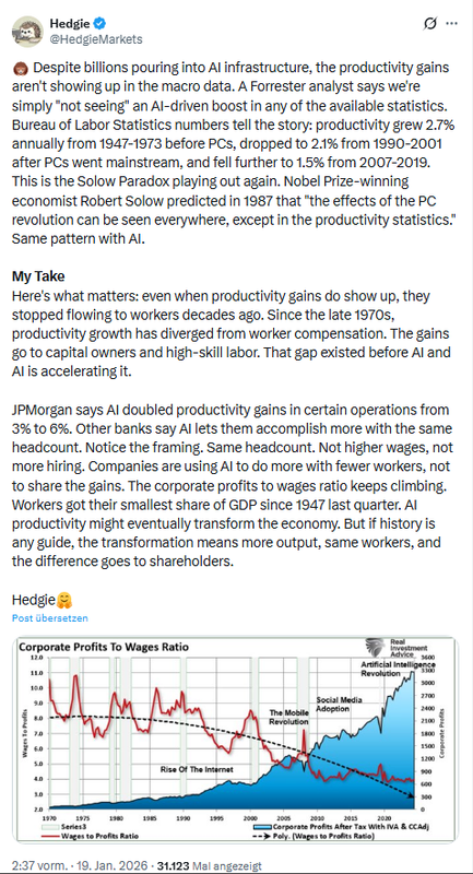 Kommen wir zu einem springenden Punkt in der Debatte um die Zukunft von KI: Irgendwer muss die Party bezahlen, und Firmen werden nur weiter auf das Thema setzen, wenn sich Vorteile ergeben. Mir ist die Tage folgender Post unter die Augen gekommen, der sich mit der Produktivität befasst.