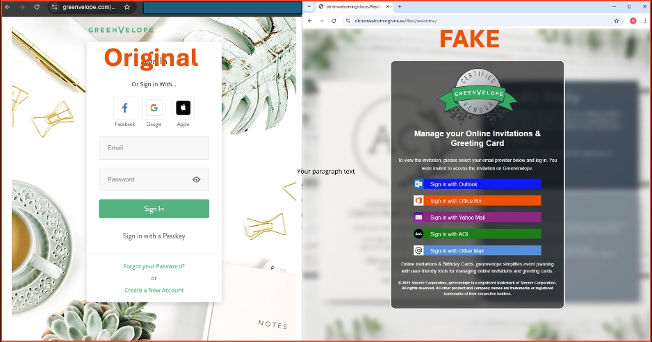 Abbildung 1: Beispiel einer echten GreenVelope-Anmeldeseite im Vergleich zur gefälschten Anmeldeseite (Quelle: KnowBe4 2026)