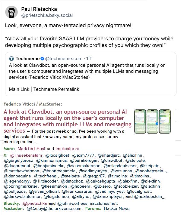 Ich habe das Thema heute über obige Posts auf Techmeme und BlueSky mitbekommen. Paul Rietschka rantet, "Seht mal alle her, ein Albtraum für die Privatsphäre mit vielen Tentakeln! Erlaubt all euren bevorzugten SAAS-LLM-Anbietern, euch Geld zu berechnen, während sie mehrere psychografische Profile von euch erstellen, die ihnen gehören!". Da hat er sicher nicht ganz unrecht. Seit Clawdbot 2026.1.24 veröffentlicht wurde, haben sich eine Menge "Vibe-Coder" und Enthusiasten auf das Projekt gestürzt und experimentieren damit. Auf reddit.com heißt es hier "Ein neues Open-Source-Projekt von Peter Steinberger namens Clawdbot ist in den letzten Wochen total abgegangen. Es ist in weniger als zwei Tagen von ~5.000 auf ~20.000 Sterne hochgeschnellt. Der Discord hat auch Tausende von Mitgliedern dazugewonnen." Peter Steinberger wurde in GitHubs Open Source Friday Livestream interviewt. Die Codebasis wachse in wahnsinnigem Tempo, weil viele Beiträge von der KI selbst geleistet werden, schreibt der reddit-Poster.