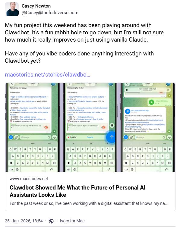ClawdBot ist ein von Peter Steinberger entwickelter Open Source KI-Assistent zum Selbsthosten. Der Bot ist in Messaging-Apps (Telegram, WhatsApp, Slack) integriert und hat ein persistentes Gedächtnis (der Bot erinnert sich tatsächlich daran, was man ihm bereits gesagt hat). Der Bot soll im im Internet surfen, E-Mails abrufen, Code ausführen und Aufgaben automatisieren können. Er sei proaktiv und sendet morgendliche Briefings, Aufgaben-Erinnerungen und Benachrichtigungen und habe vollen Zugriff auf den Computer (wird nicht jeder wollen). Das Ganze läuft rund um die Uhr auf einem Server für 5 $/Monat, heißt es.
