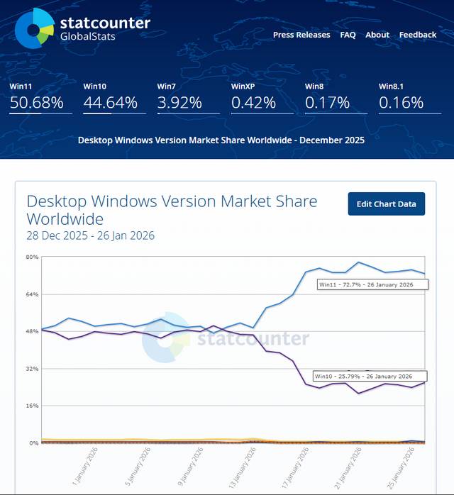 Ein Blog-Leser hat gerade einen Link auf Statcounter gepostet, wo die Windows-Verteilung aufgeschlüsselt wird. Zu Beginn des Januar 2026 lagen Windows 10 und Windows 11 fast gleichauf bei ca. 50 % mit leichten Vorteilen für Windows 11. Am 25. Januar 2026 behauptet Statcounter, dass Windows 11 bei 72,7 %, während Windows 10 auf 25,79 % gesunken ist.