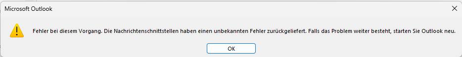 "Fehler bei diesem Vorgang. Die Nachrichtenschnittstellen haben einen unbekannten Fehler zurückgemeldet. Falls das Problem weiter besteht, starten Sie Outlook neu."