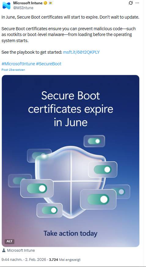 Die Tage bin ich auf nachfolgenden Post von Microsoft gestoßen, der sich mit dem Thema "Secure Boot" für Windows befasst und auf ein Playbook von Microsoft Intune zum Thema verweist.