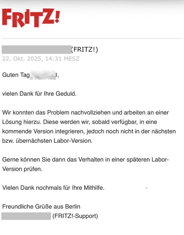 Ist jemand von diesem Problem betroffen? Ergänzung: Ein Benutzer hat auf Facebook die Kopie des obigen Schreibens von FRITZ mit mir geteilt. Er schrieb auf meine Frage, ob jemand tangiert sei: "Ja, ich war und bin massiv betroffen. Das traurige an der Geschichte ist dass dieser Fehler seit der ersten Labor-Version da war, und er sehr wohl Fritz bekannt war. Dies obige Mail habe ich im Oktober 2025 zu diesem gemeldeten Fehler bekommen.