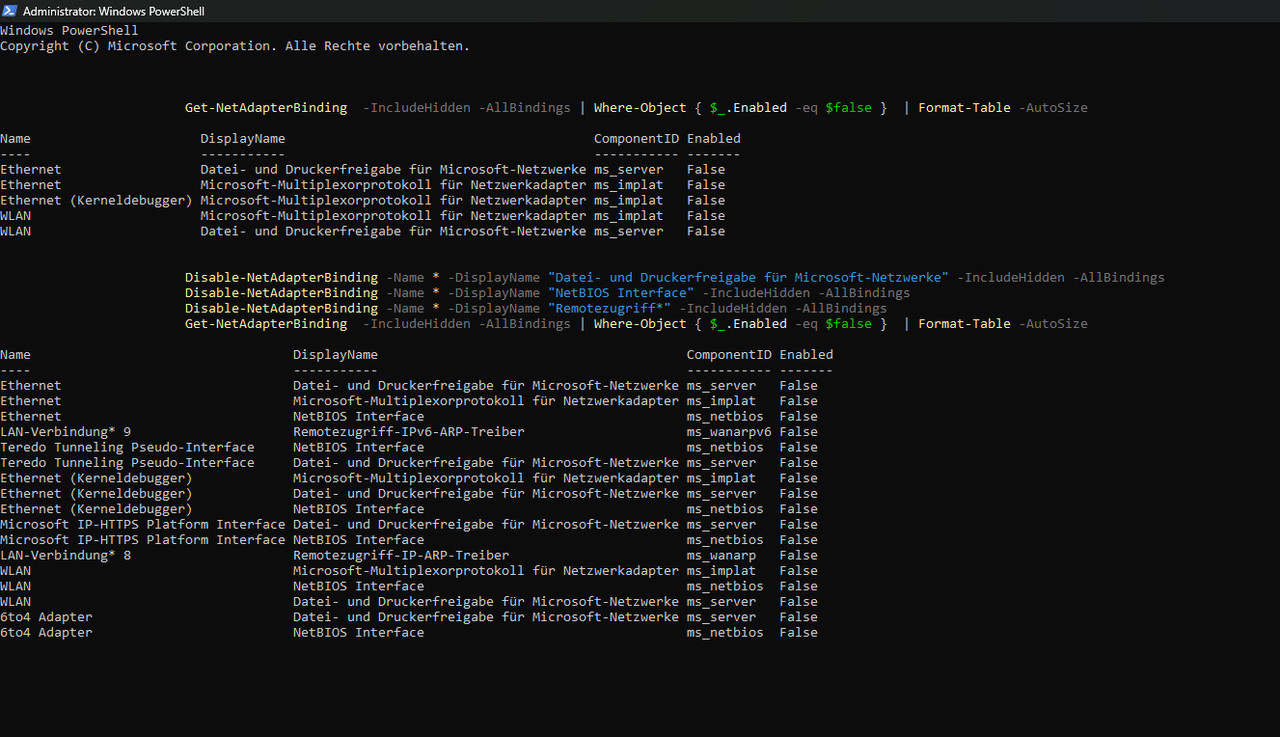Der anonyme Nutzer erwähnte dann noch einen Bug in Windows 11 25H2. Wird in der Systemsteuerung unter Netzwerk und Internet\Netzwerkverbindungen\Ethernet die Datei- und Druckerfreigabe abgewählt, werden nur Teile deaktiviert. Nur per PowerShell lässt sich die Datei- und Druckerfreigabe wirklich vollständig deaktivieren.