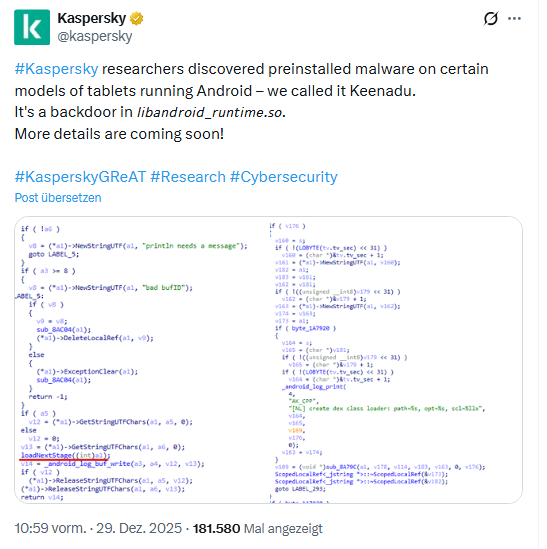 Das Ganze macht die Tage die Runde, Kaspersky hat meinen Informationen nach aber bereits erste Informationen im Ende 2025 bekannt gegeben. Nachfolgender Tweet verweist auf einen Malware-Fund in Form der Keenadu-Backdoor in einer Laufzeitbibliothek, also der Android-Firmware.