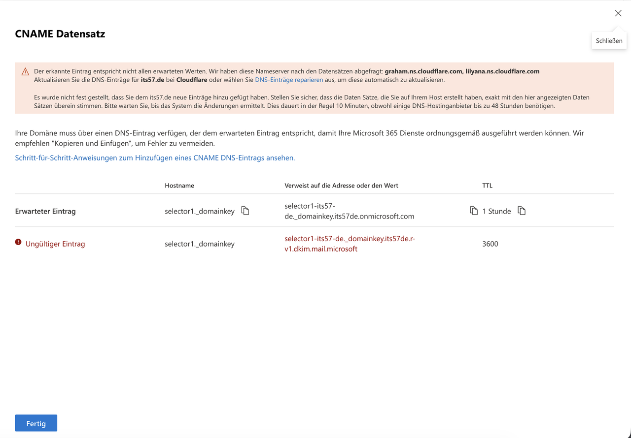 Wir haben auch das Problem, allerdings sind es bei uns nicht die DKIM Einträge, die sind weiterhin in Ordnung, bei uns sagt er, dass die MX Records Richtung Mimecast plötzlich falsch sind. Ich habe das erstmal ignoriert weil alles ordnungsgemäß funktioniert.