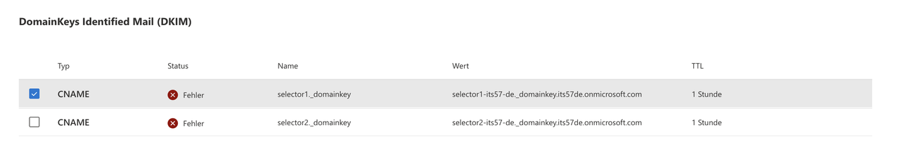 Für DKIM wird ein ungültiger Eintrag unter dkim.mail.microsoft angezeigt (siehe obige Abbildung). Dieser DNS-Eintrag löst dann Fehlermeldungen aus.