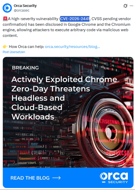 Orca Security schreibt dazu in obigem, aktuellen Tweer: "Eine Sicherheitslücke mit hohem Schweregrad (CVE-2026-2441) wurde in Google Chrome und der Chromium-Engine entdeckt. Diese ermöglicht es Angreifern, über bösartige Webinhalte beliebigen Code auszuführen. Die Schwachstelle wird laut diesem Blog-Beitrag ausgenutzt.