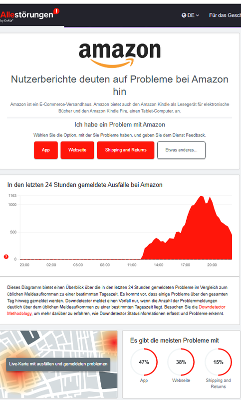 In einer Zusammenfassung kann man bei Amazon derzeit von einen größeren und mehrstündigen Ausfall ausgehen. Es gibt Probleme beim Bezahlen, Bestellungen werden nicht angezeigt, Zahlungsfehler treten auf und es gibt App-Störungen. Derzeit liegen Tausende Meldungen, vor allem aus Deutschland, Großbritannien (bzw. Europa) seitdem heutigen Mittag vor. Die Webseite und die Kerndienste von AWS funktionieren dagegen einwandfrei. Die Störung betrifft den Webshop.