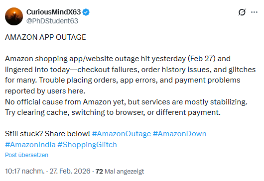 Mir ist aber auch obiger Tweet auf X untergekommen, der Amazon in Indien als gestört thematisiert. Es gibt keine offizielle Stellungnahme von Amazon. Jemand von der Störung betroffen?
