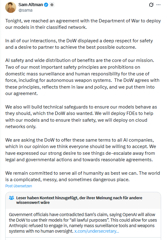Altman schrieb auf X, dass man die eigenen Positionen von OpenAI mit der Vereinbarung nicht aufgegeben habe, es gäbe "Sicherheitsmechanismen", um den Einsatz in letalen Waffen und zur Massenüberwachung von US-Amerikanern zu verhindern. The Verge hat den Sachverhalt zum 28. Februar 2026 in diesem Artikel ebenfalls beschrieben. Von OpenAI gibt es zudem diese Stellungnahmen zum Vertrag mit dem Verteidigungsministerium. Hier ein kurzer Auszug: