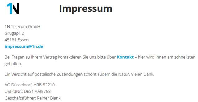 Aber die Änderungen gehen aus dem Impressum der Webseite der 1N Telecom GmbH hervor. Krass empfinde ich die in obigem Screenshot dokumentierte Aufforderung, zum Verzicht auf "postalische Zusendungen" zur Schonung der Natur. Nutzer, die den unberechtigten Forderungen der 1N Telecom GmbH wehren, werden das Unternehmen unter den alten Adressen (die wechseln häufiger) anschreiben. Wobei die Erfahrung aus der Vergangenheit zeigt, dass selbst Einschreiben an die Absender zurück kamen.