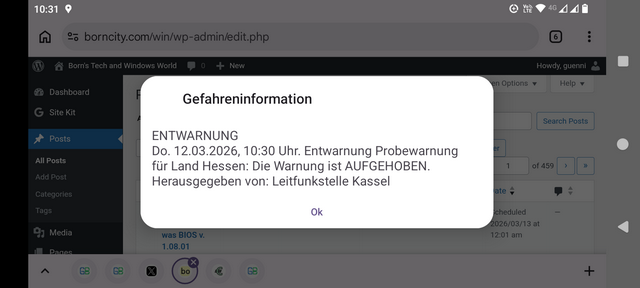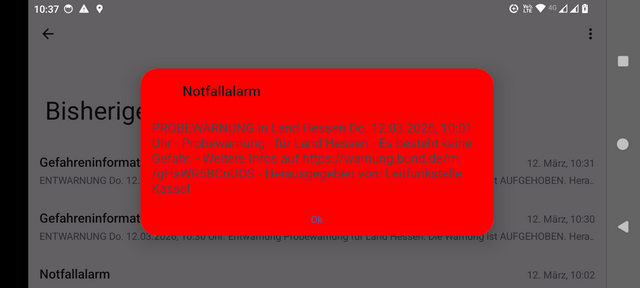 Es ist irgendwie total an mir vorbei gegangen. Am heutigen 12. März 2026 fand um 10:00 Uhr ein Probealarm statt. Das ist der Warntag, der im Frühjahr (März) in verschiedenen deutschen Bundesländern stattfindet. Bei diesem Probealarm soll die Benachrichtigung der Bevölkerung bei Katastrophen überprüft werden. Hier bei mir haben die Warnung und auch die Entwarnung um 10:30 Uhr per Sirene und Smartphone wunderbar funktioniert. Wie schaut es bei euch aus?
