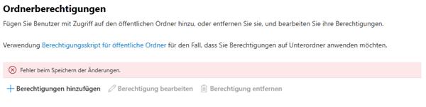 "Alte Berechtigungen [setzen/verändern] und alles andere funktioniert.", merkte der Leser an. Versucht er im Admin-Bereich des Tenants Ordnerberechtigungen zu setzen, erhält er bei öffentlichen Ordnern die Meldung "Fehler beim Speichern der Änderungen".
