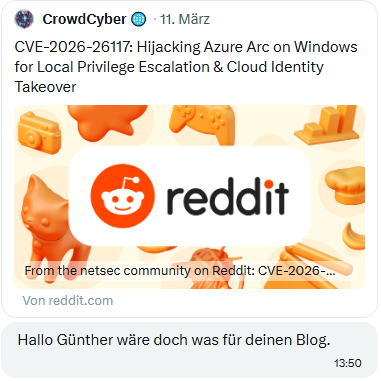 Auf X hat mich jemand in einer privaten Nachricht auf eine reddit.com-Diskussion CVE-2026-26117: Hijacking Azure Arc on Windows for Local Privilege Escalation & Cloud Identity Takeover aufmerksam gemacht (danke dafür).