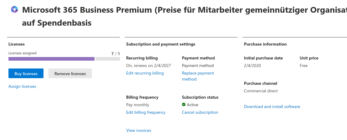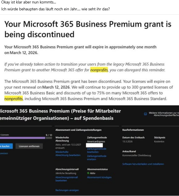 Andere Kommentatoren schrieben, dass die Lizenz trotzdem für 0 Euro/Jahr verlängert wurde. Zum 10. März 2026 hat mich ein weiterer Leser per Mail kontaktiert und schrieb "Ggf. könnten Sie das Thema nochmal neu aufbereiten, da Microsoft wohl jetzt ernst macht und den Non-Profits das Premium Paket deaktiviert."