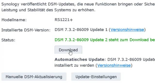 Der Leser schreibt: "Etwas später kann man dann nur noch auf den Download-Button klicken, was aber nichts bringt". Er hat mir ein Video geschickt, aus dem ich den obigen Screenshot angefertigt habe. Vom Leser wurden die nachfolgenden Synology Diskstation-Modelle bezüglich Updates getestet:
