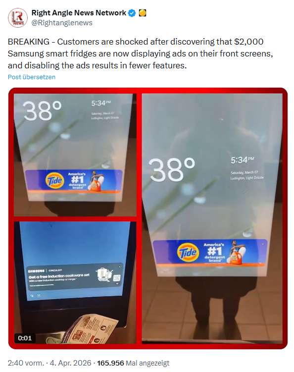 Ich kann mich mit Sticheln einfach nicht zurück halten, wenn ich etwas für einen ausgemachten Schwachsinn halte – ist sozusagen Alters-DNA (die beiden Herren hier haben ja gut vorgelegt). Im November 2025 hatte ich im Beitrag Fortschritt ist, wenn Auto und Kühlschrank Display-Werbung zeigen berichtet, dass Samsung in den USA smarte Kühlschränke mit Werbung auf dem Display anbieten wird.