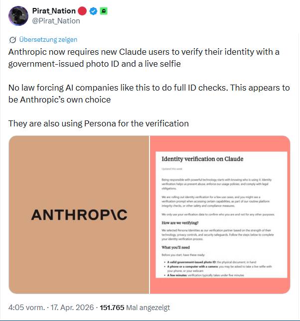 Die Botschaft ist klar: KI-Anbieter Anthropic verlangt nun von neuen Claude-Nutzern, dass sie ihre Identität mit einem amtlichen Lichtbildausweis und einem Live-Selfie bestätigen. Es gebe kein Gesetz, das KI-Unternehmen wie dieses zu einer vollständigen Identitätsprüfung verpflichtet. Dies scheint eine eigenständige Entscheidung von Anthropic zu sein, heißt es in obigem Tweet. Und dann hat mich die Information, dass dieser Identitätsnachweis über die US-Firma Persona erfolgt, sofort getriggert.