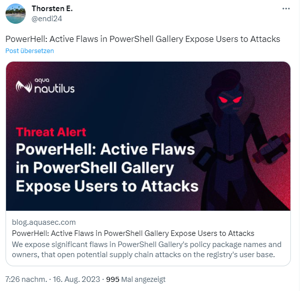 PowerShell Gallery modules are commonly used as part of the cloud deployment process, especially popular on AWS and Azure, to interact with and manage cloud resources. Therefore, the installation of a malicious module could be fatal for enterprises. And this is exactly the issue, which has been disclosed by security researchers. I became aware of the issue through various media, which is addressed by Aqua Security in the following tweet under the term "PowerHell" and documented in the blog post PowerHell: Active Flaws in PowerShell Gallery Expose Users to Attacks.