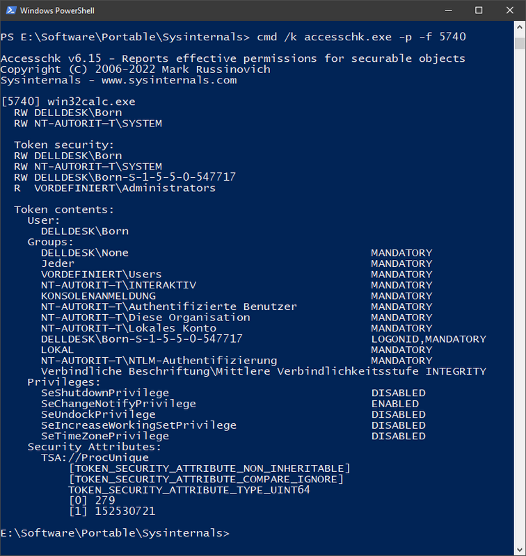 Subsequently, I used accessschk.exe from the Sysinternals tools to view the permissions of the calc.exe process in question. If I am not completely misinterpreting, an increase in permissions still requires approval via User Account Control. But the situation may allow the launch of malware by chaining other applications, without security software possibly not noticing – because they trust workfolders.exe.