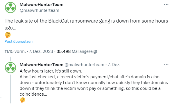 I therefore assume that the group will soon strike again. The Register reports here that the group was able to get its website back up and running and listed more victims in the hours before the law enforcement agency published the above report. And if this group does not attack the systems, other ransomware groups will continue. As long as IT infrastructures around the world are so poorly secured and software is in an absolutely disastrous state of security, not much will change – the action against ALPHV/BlackCat is a stage victory, nothing more and nothing less.