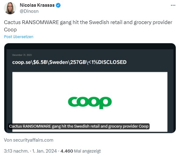 [German]The Swedish Coop supermarket group has probably fallen victim to another cyberattack. I read a few days ago that the ransomware group Cactus, which has been operating since 2023, listed Coop as a victim on its Tor leak page. In the meantime, Coop has probably confirmed that ransomware has infected the stores in the Värmland region. In 2021, 800 Coop stores in Sweden stopped working because a cyberattack on a checkout operator had paralyzed them.