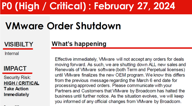 Lenovo writes that they are aware that this differs from a previous message regarding the March 6 end date for processing approved orders. They are requesting that partners and customers share the information that VMware by Broadcom has ceased operations until further notice. As the situation evolves, Lenovo will keep customers informed of any official changes from VMware by Broadcom.