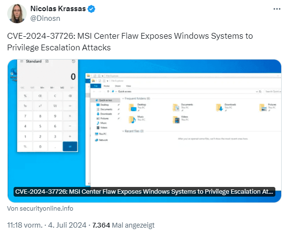 [German]A quick note for Windows users who have the MSI Center from Micro-Star International installed on their system. There is a Local Privilege Escalation vulnerability CVE-2024-37726 in this software that allows an attacker to gain system privileges. Versions <= 2.0.36.0 are affected – anyone using this software on their system should therefore update to be on the safe side.
