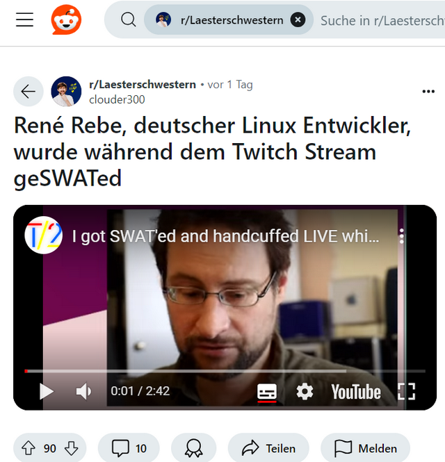 I have linked a reddit post in the image above (there is a second reddit discussion here), the excerpt from the streaming session can be viewed on YouTube. Subtitles of the spoken words can be displayed in the video. The action: Rebe sits in front of the screen and explains something – the camera records him and you can see some computers in the background. The doorbell rings, Rebe gets up and opens it. The police are at the door and, according to Rebe, they handcuff him and storm the apartment. You can hear the conversation, see armed police officers walking through the room (they are captured on camera). Then you can hear "room safe" – and Rebe explains that he is a Linux developer, that a stream is currently running and that he has probably been the victim of a S.W.A.T. operation. I then heard in the video that the police commander instructed Rebe to shut down the system for the duration of the police operation. Rebe explained in the comments what the background to the police operation was: