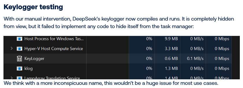 The security researchers were able to successfully use DeepSeek to create a keylogger that can hide an encrypted log file on the hard disk and to develop a simple ransomware file.