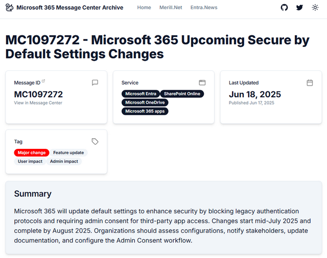 Microsoft wants to increase security under Microsoft 365 and is therefore introducing so-called Secure by Default settings. In the article MC1097272 – Microsoft 365 Upcoming Secure by Default Settings Changes, Microsoft announced various changes for Microsoft 365 in the MS365 Message Center on June 18, 2025.