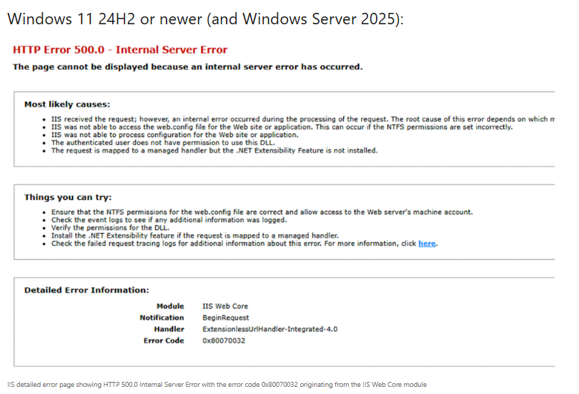 Starting a web app (ASP.NET) in IIS Express may result in an error message. While this is still reasonably meaningful with "can't reach the page …" in Windows 10 or up to Windows Server 2022, Windows 11 24H2 and Windows Server 2025 return an Error 500. Error code 0x80070032 (ERROR_NOT_SUPPORTED) may be reported.