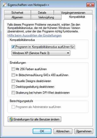 Manche Anwendungen müssen permanent unter Administratorberechtigungen ausgeführt werden. In diesem Fall markieren Sie auf der Registerkarte Kompatibilität das Kontrollkästchen Programm als Administrator ausführen. Ist das Kontrollkästchen gesperrt? Dann arbeiten Sie unter einem Standardbenutzerkonto. Zum Konfigurieren klicken Sie auf die Schaltfläche Einstellungen für alle Benutzer ändern, bestätigen die Benutzerkontensteuerung und legen die Kompatibilitätsoptionen im neu eingeblendeten Dialogfeld fest.