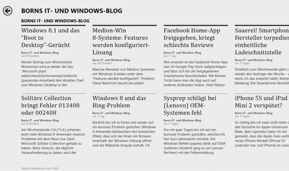 Die Bing Nachrichten-App kann nun Neuigkeiten in Tabs organisieren und unterstützt das Abonnement von RSS-Feeds. Hier der Feed meines Blogs. Insgesamt ganz nett, dass die Funktion nun in der Nachrichten-App nachgerüstet wurde. Aber unterm Strich wieder nichts wirklich richtiges. Wählt man einen Eintrag, wird eine Webseite mit dem Feed-Inhalt in der App angezeigt. Geht halbwegs fix – besser als bei anderen RSS-Readern. Aber eine schnelle Navigation durch die Nachrichten des Feeds ist nach wie vor nicht möglich. Zudem habe ich auf die Schnelle keine Option gefunden, um den Feed meines Blogs fest in der Nachrichten-App zu verankern. Lediglich eine Kachel lässt sich auf der Startseite festlegen.
