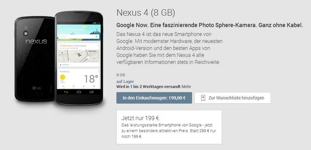 Geht man heute in den Google Play Store, wird einen das Nexus 4 mit 8 GByte zum Preis von 199,00 Euro angeboten – die 16 GByte-Version kostet nur noch schlappe 249 Euro.