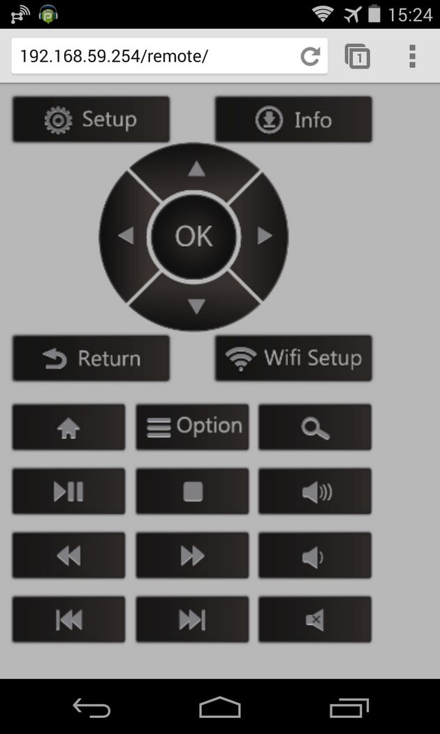 Im DLNA-Modus lässt sich die in folgendem Foto sichtbare Fernbedienungsseite zur Konfigurierung unter der auf dem Bildschirm angegebenen URL abrufen.