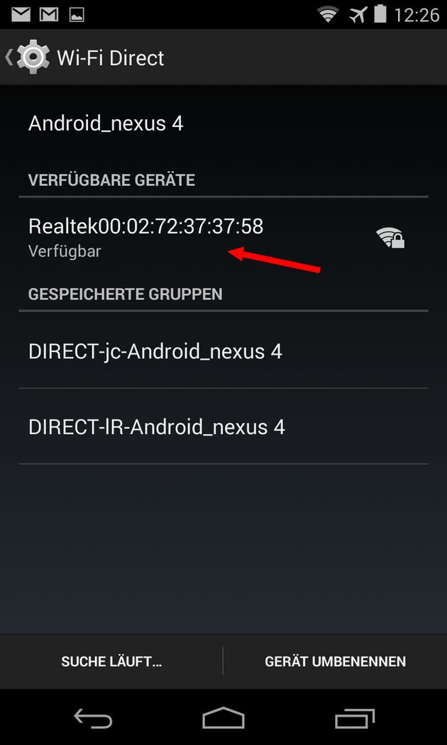 Nun lässt sich mit einem miracast-fähigen Sender eine Kopplung versuchen. Die Miracast-Tests habe ich unter Android 4.4 (Kitkat) mit einem Nexus 4 durchgeführt. Bei der ersten Kontaktaufnahme ist eine Wi-Fi Direct-Kopplung auszuführen. Hierzu ist in der Android-App Einstellungen die Kategorie WLAN aufzurufen und dann die Wi-Fi-Direkt-Funktion aufzurufen (siehe auch diesen Artikel).